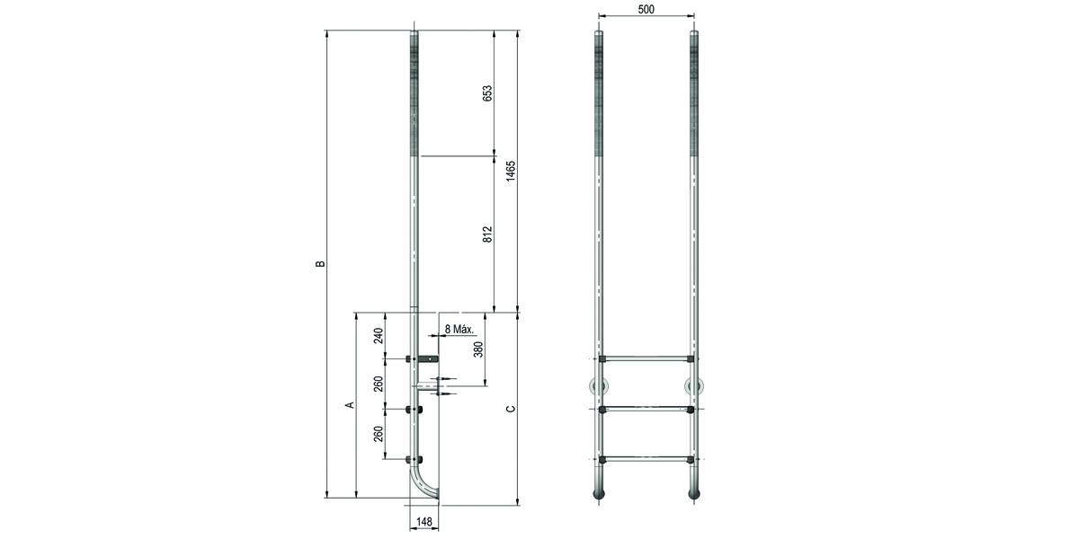Элегантные лестницы со ступеньками и вертикальными стойками для легкого входа в воду. Изготовлены из нержавеющей стали AISI-316 с 2 анкерами.