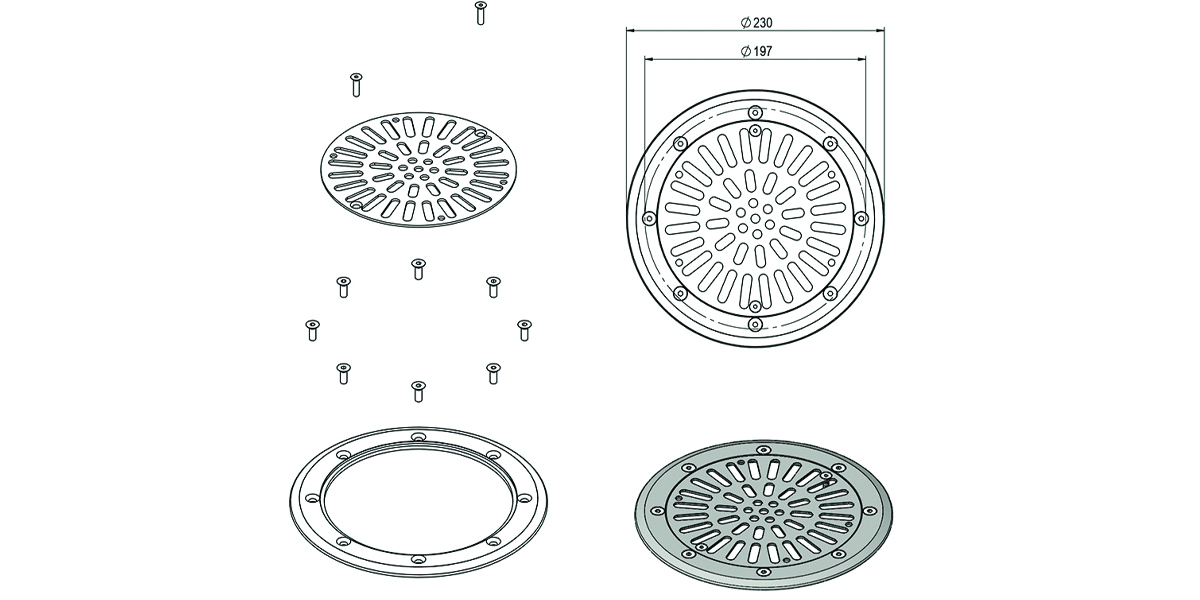 Накладка, полностью изготовленная из нержавеющей стали AISI-316L, для основных донных сливов из ABS-пластика.