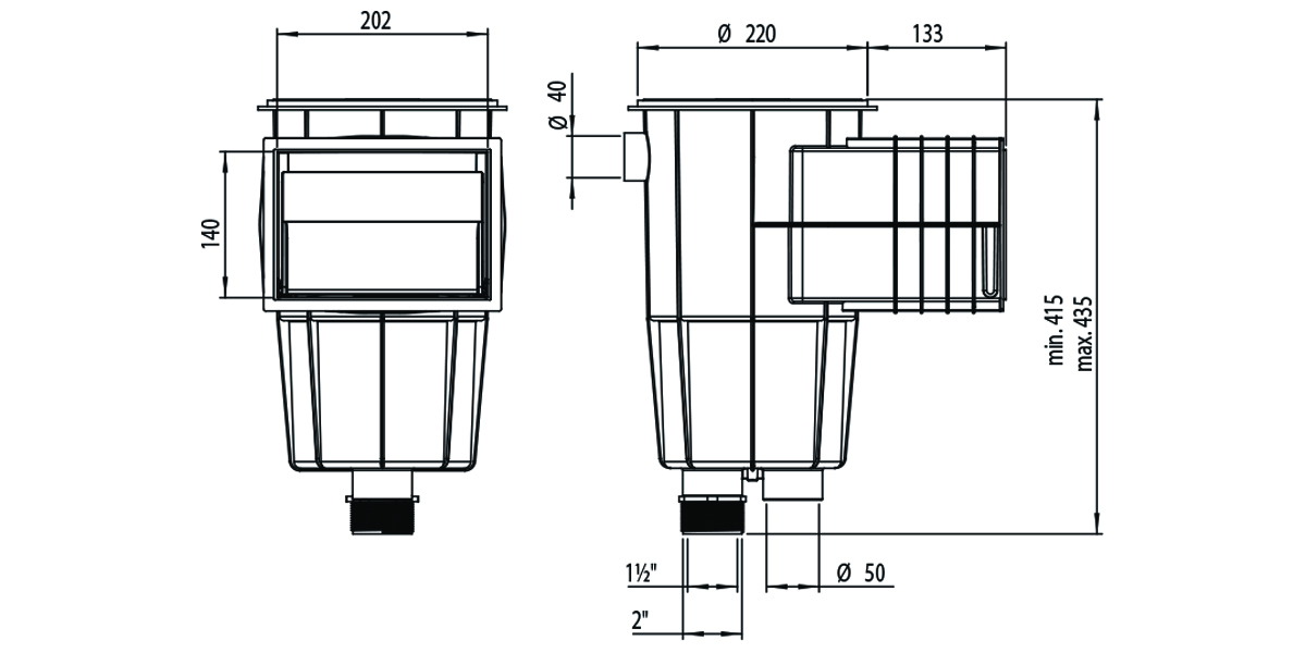Переливной патрубок диаметром 40 мм.